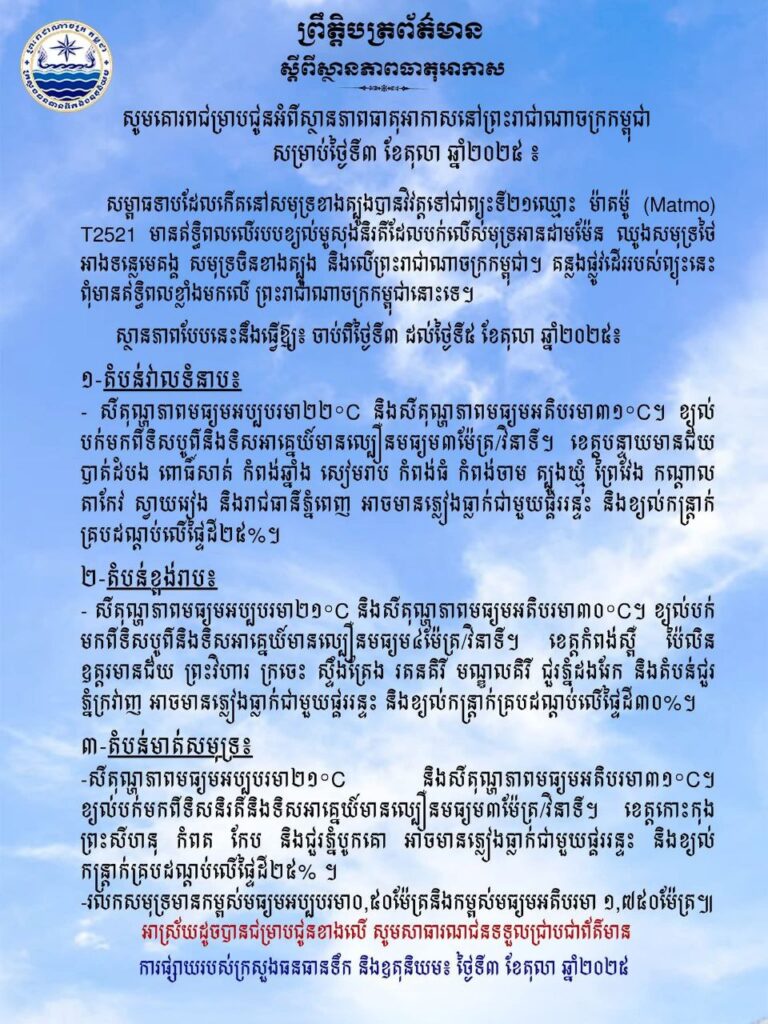 ស្ថានភាពធាតុអាកាស នៅកម្ពុជាចាប់ពីថ្ងៃទី៣ដល់ថ្ងៃទី៥ខែតុលាឆ្នាំ២០២៥!