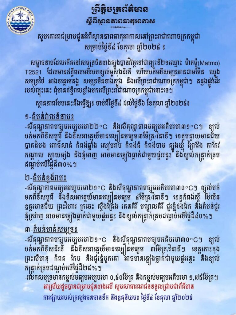 ខ្យល់មូសុងឦសានដែលបក់ លើសមុទ្រចិនខាងត្បូងចាប់ផ្តើមមានឥទ្ធិពល ខណៈសម្ពាធ ទាប បន្តគ្របដណ្តប់លើភាគខាងក្រោមនៃអាងទន្លេមេគង្គ និងលើព្រះរាជាណាចក្រកម្ពុជា។ស្ថានភាព បែបនេះនឹងធ្វើឱ្យ៖ ចាប់ពីថ្ងៃទី៤ដល់ថ្ងៃទី៦ខែតុលាឆ្នាំ២០២៥