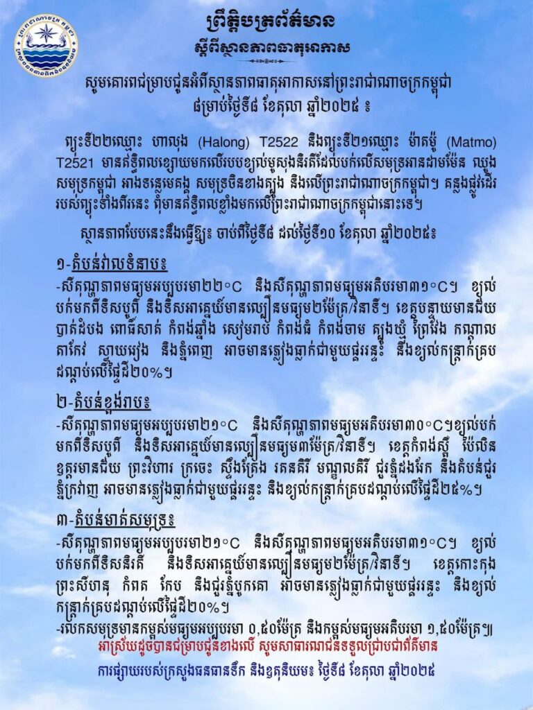 ខ្យល់មូសុងឦសានដែលបក់ លើសមុទ្រចិនខាងត្បូងចាប់ផ្តើមមានឥទ្ធិពល ខណៈសម្ពាធ ទាប បន្តគ្របដណ្តប់លើភាគខាងក្រោមនៃអាងទន្លេមេគង្គ និងលើព្រះរាជាណាចក្រកម្ពុជា។ស្ថានភាព បែបនេះនឹងធ្វើឱ្យ៖ ចាប់ពីថ្ងៃទី៨ដល់ថ្ងៃទី១០ខែតុលាឆ្នាំ២០២៥