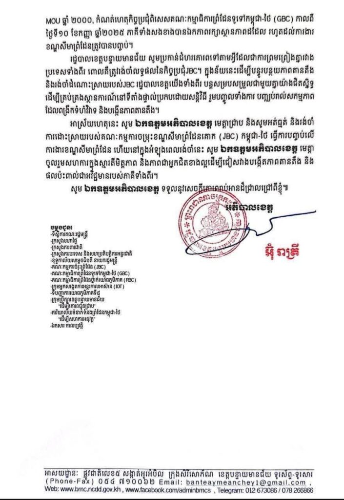 អាស្រ័យហេតុនេះ សូម ឯកឧត្តមអភិបាលខេត្ត មេត្តាជ្រាប និងសូមអត់ធ្មត់ និងរង់ចាំ ការដោះស្រាយរបស់គណៈកម្មការចម្រុះខណ្ឌសីមាព្រំដែនគោក (JBC) កម្ពុជា-ថៃ ធ្វើការបញ្ចប់លើ ការងារខណ្ឌសីមាព្រំដែន ហើយនៅក្នុងអំឡុងពេលរង់ចាំនេះ សូម ឯកឧត្តមអភិបាលខេត្ត មេត្តា ចូលរួមសហការក្នុងស្មារតីមិត្តភាព និងភាពជាអ្នកជិតខាងល្អដើម្បីជៀសវាងបង្កើតភាពតានតឹង និង ផលប៉ះពាល់ជាអវិជ្ជមានរបស់ភាគីទាំងពីរ៕
