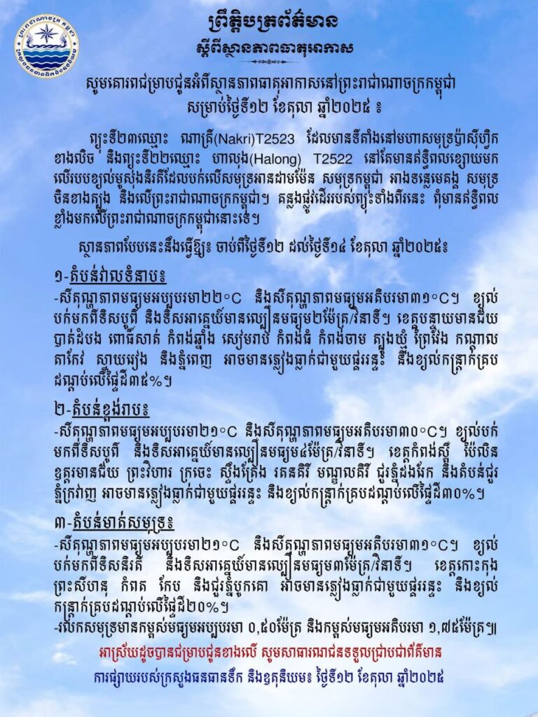 (ភ្នំពេញ)៖ ក្រសួងធនធានទឹក និងឧតុនិយម បានចេញសេចក្តីជូនដំណឹង អំពីស្ថានភាពធាតុអាកាសនៅកម្ពុជា សម្រាប់ថ្ងៃទី១២ខែតុលាឆ្នាំ២០២៥។