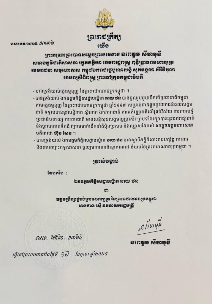 (ភ្នំពេញ)៖ នៅរសៀលថ្ងៃទី១៦ ខែតុលា ឆ្នាំ២០២៥ ព្រះករុណា ព្រះបាទ សម្ដេច ព្រះមរបនាថ នរោត្តម សីហមុនី ព្រះមហាក្សត្រនៃកម្ពុជា ទ្រង់បានចេញព្រះរាជក្រឹត្យត្រាស់បង្គាប់តែងតាំង លោកកិត្តិសេដ្ឋាបណ្ឌិត ឆាយ ថន ជាឧត្តមប្រឹក្សាផ្ទាល់ព្រះមហាក្សត្រ ឋានៈស្មើឧបនាយករដ្ឋមន្រ្តី៕