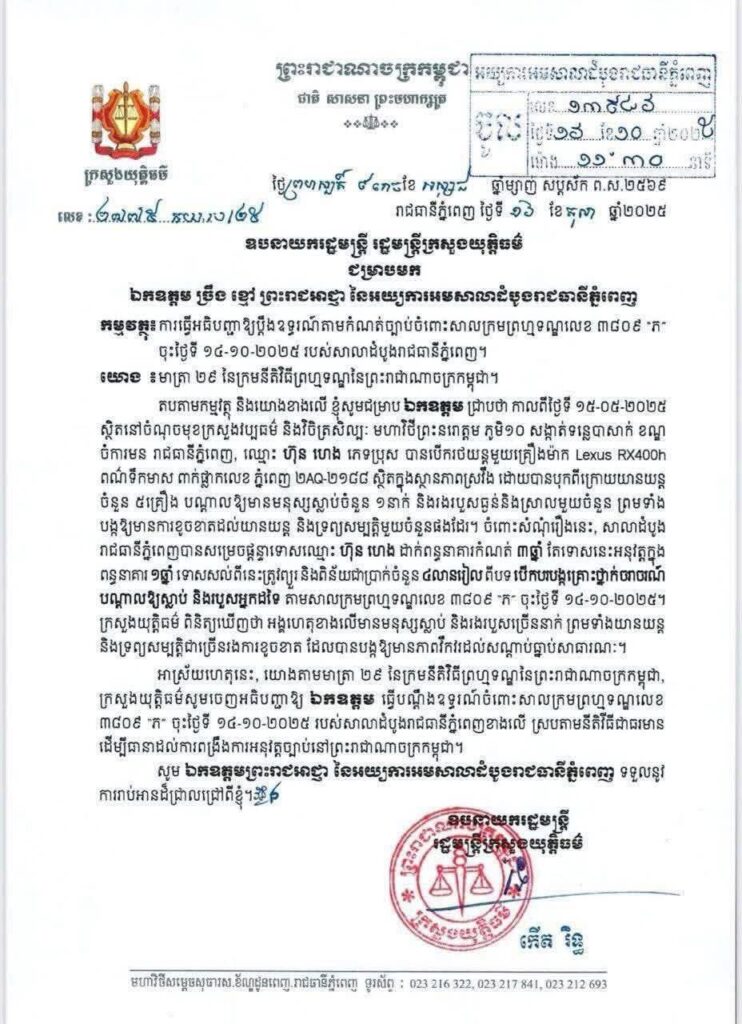 នេះបើយោងតាមលិខិត របស់ក្រសួងយុត្តិធម៌ចុះថ្ងៃទី១៦.១០.២០២៥។