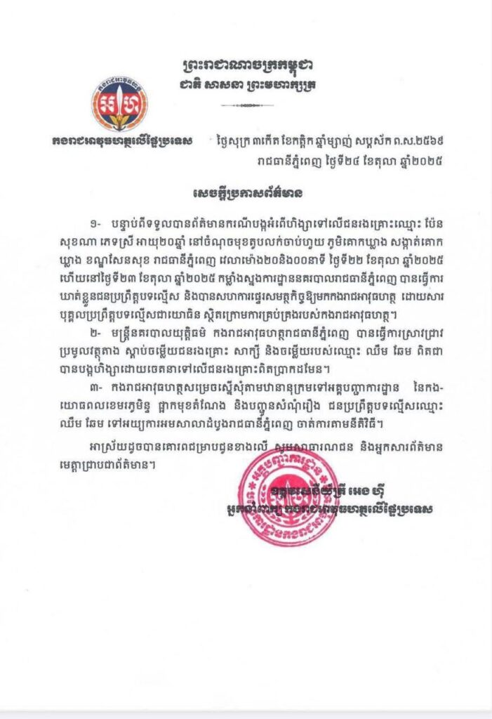 រហូតដល់រសៀលថ្ងៃទី២៣.១០.២០២៥ សមត្ថកិច្ចបានឃាត់ខ្លួនលោកផ្កាយ១ ឈឹម ឆែម ដើម្បីចាត់ការតាមច្បាប់តែម្ដងទៅ៕